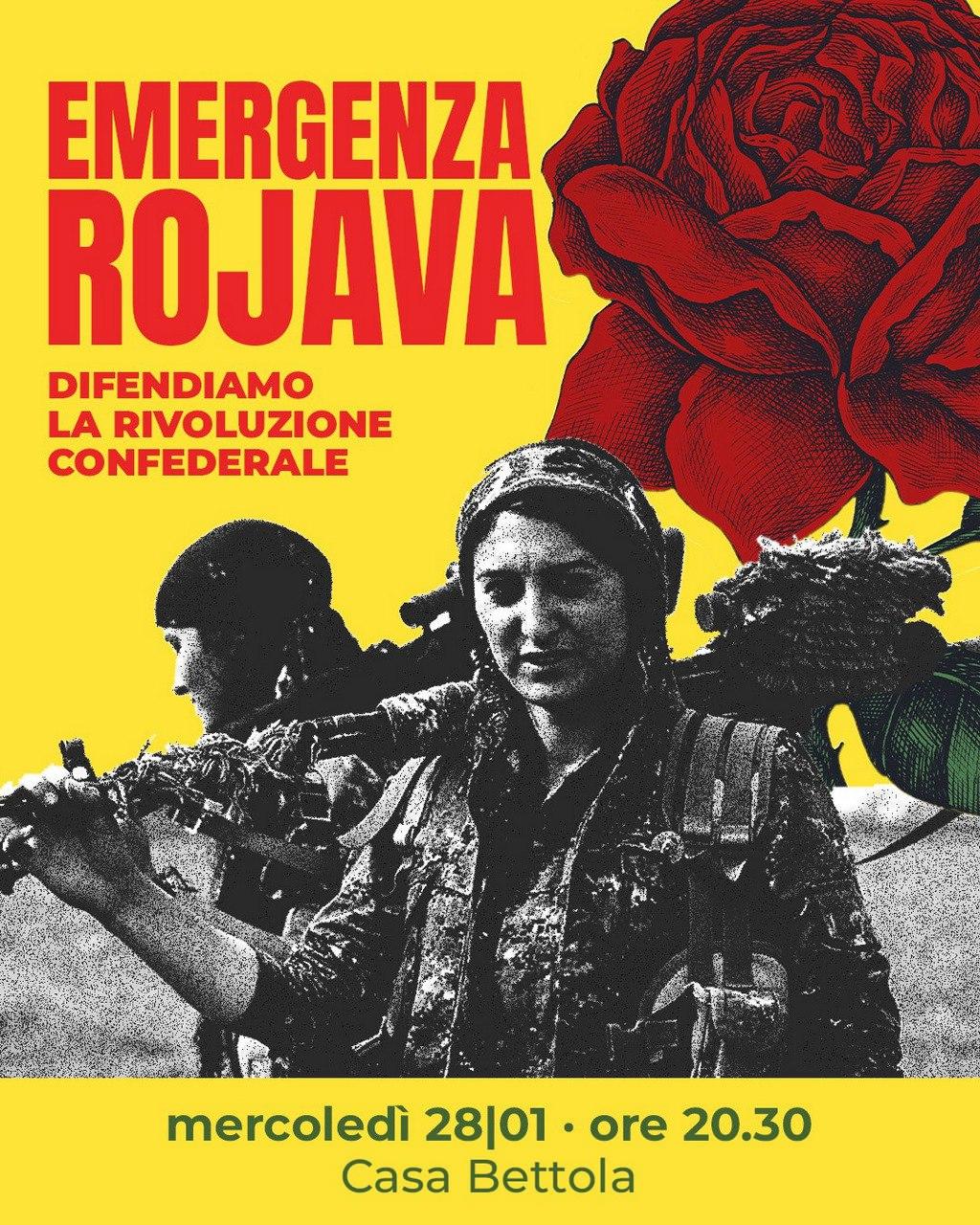 La rivoluzione confederale del Rojava è sotto attacco. Per questo invitiamo tuttə mercoledì 28 alle 20:30 a Casa Bettola per una serata di solidarietà, informazione e mobilitazione, per mantenere alta l’attenzione internazionale e raccogliere fondi a sostegno di progetti umanitari per le popolazioni attaccate.